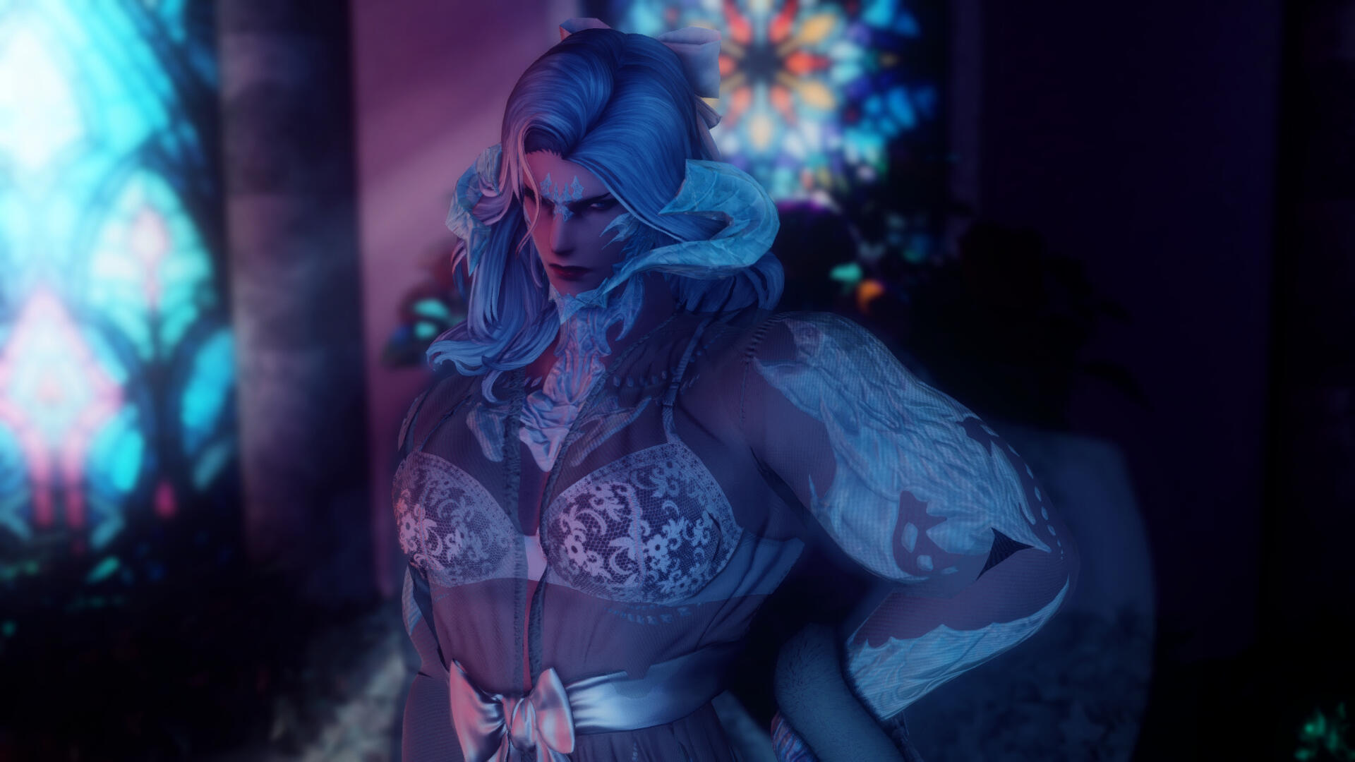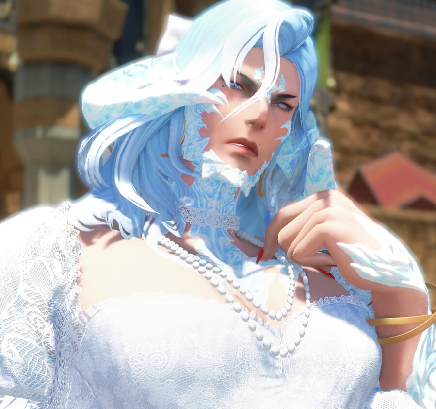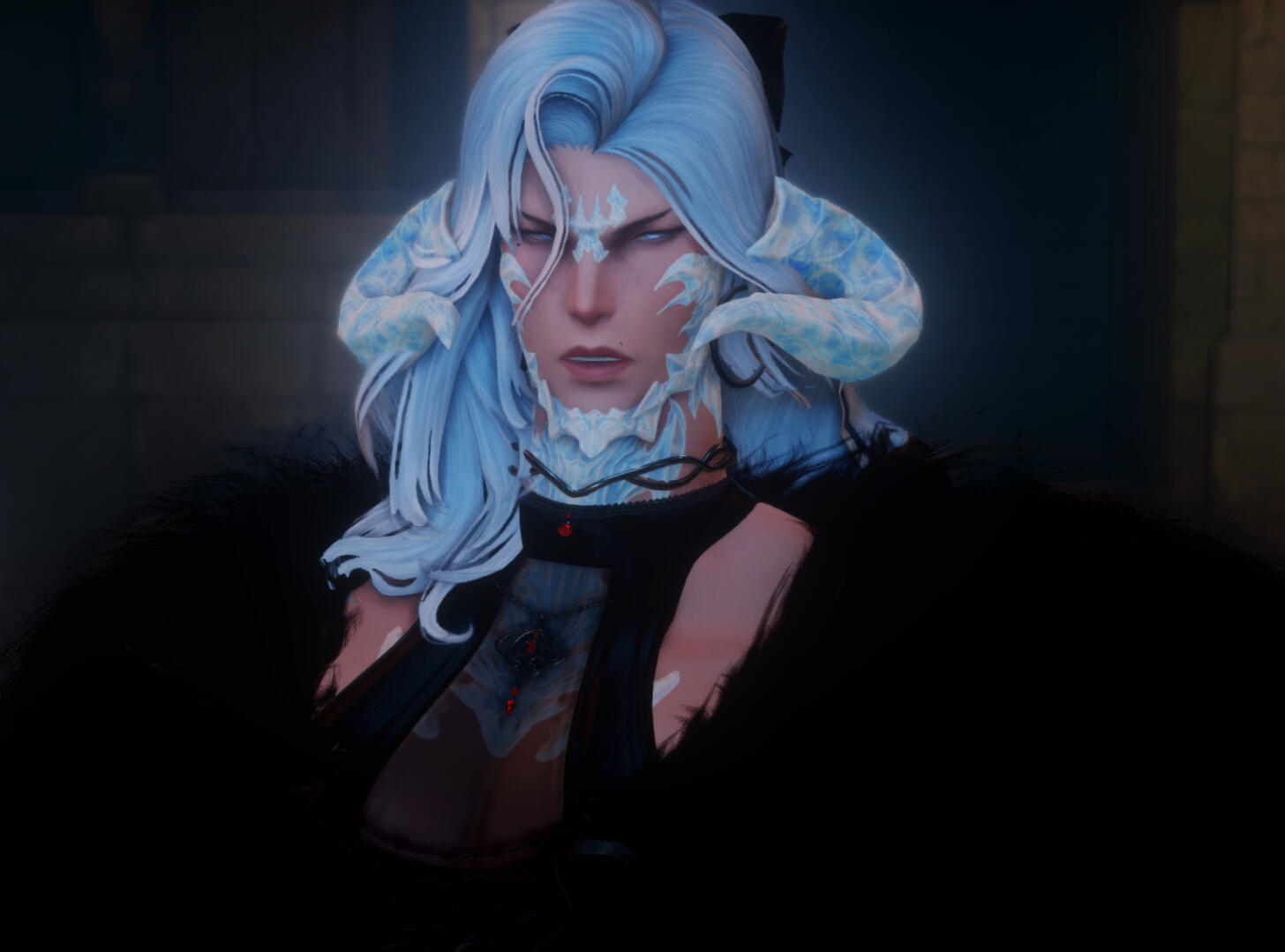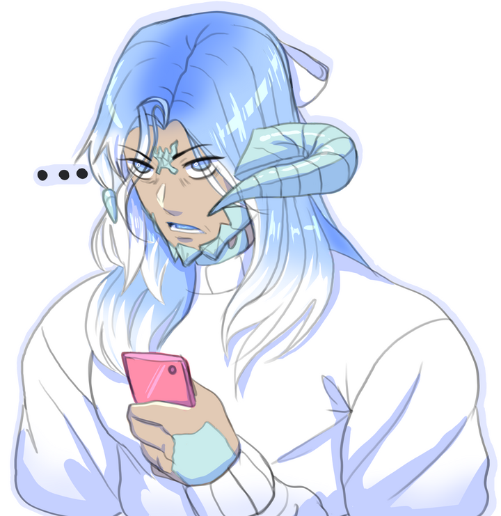 Strange icy toned scales cover his body with hair and eyes to match the blue tones. He most likely wont talk about it.
